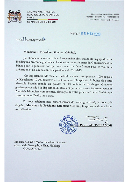 ¿ËÈÕ£¬¹ãÒ©¼¯ÍÅÊÕµ½ÁËÀ´×Ô±´Äþ¹²ºÍ¹úפ»ª´óʹ¹Ý¼°´óʹ¶Ô¹ãÒ©¼¯Íż°¹ãÒ©¼¯ÍŶʳ¤Àî³þÔ´µÄллÐÅ£¬¶Ô¹ãÒ©¼¯ÍŰ®ÐÄÔ®ÍòÀÓë±´Äþ¹²ºÍ¹ú¹²µ£·çÓê¡¢¹²¿Ëʱ¼è£¬Ð¯ÊÖ¿¹ÒßËù×öµÄÆð¾¢ÌåÏÖлл¡£